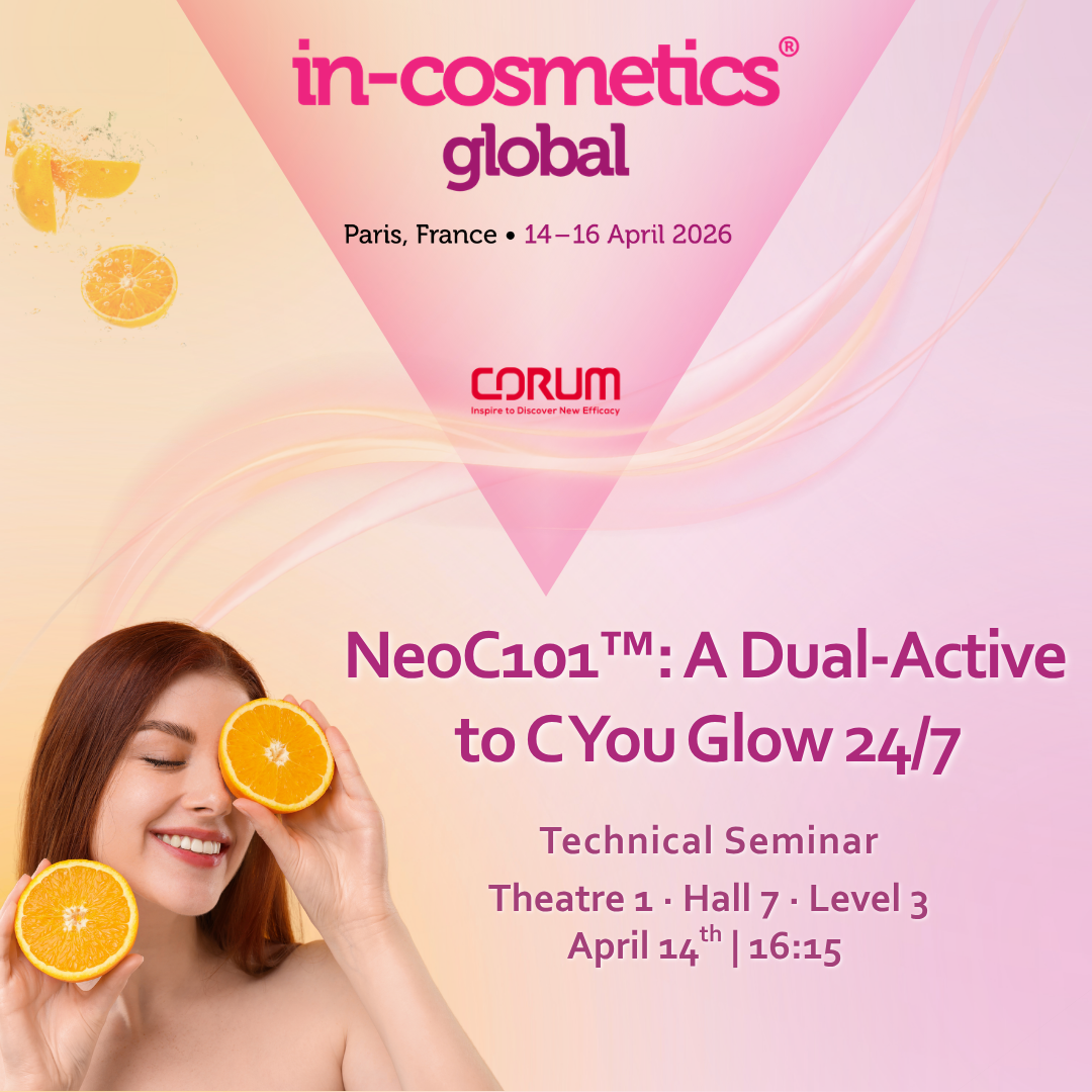 歡迎於 in-cosmetics Global Paris 2026 與 CORUM 一同探索 NeoC101™ 所帶來的「C You Glow, 24/7」全新概念。