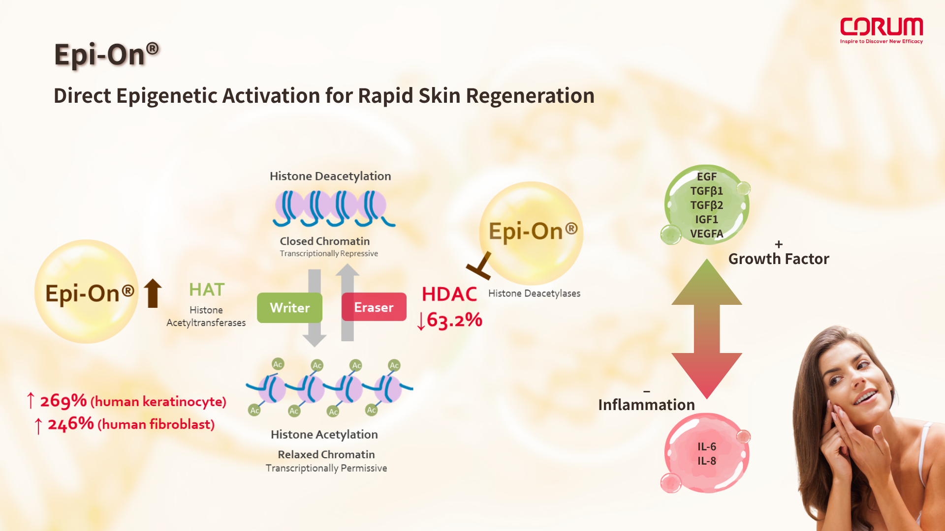 Epi-On® is a next-generation epigenetic regulatory molecule designed to directly enhance histone acetylation, a key modification that plays a central role in regulating anti-inflammatory responses, cellular regeneration, and migration.