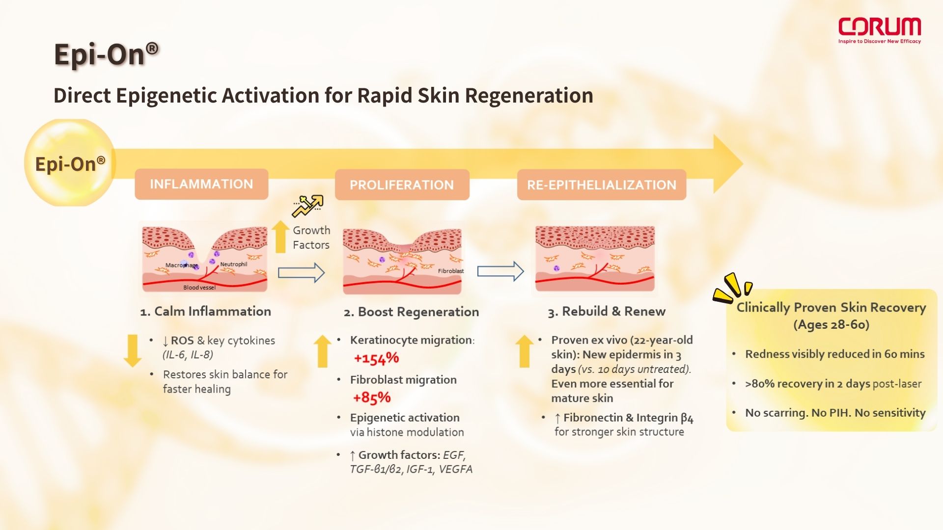 At the same time, Epi-On® operates at the epigenetic level, modulating gene expression related to healing, proliferation, and regeneration. This dual mechanism enables precise activation of repair pathways across both the epidermis and dermis, achieving structural repair × biological renewal. Future skin repair systems will no longer rely solely on nature-inspired mimics, but will instead harness the power of high-precision molecular design and signal-guided regeneration for faster, more stable, and more targeted outcomes.